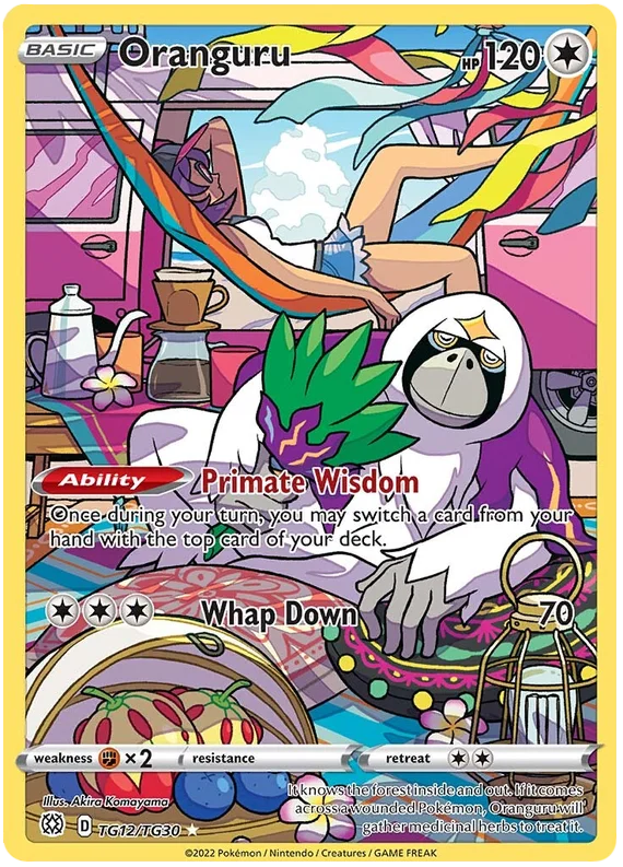 "Unleash your Primate Wisdom with the 2022 Brilliant Stars TG12 Oranguru! Harness the power of switching cards from your hand with the top of your deck, giving you the control and confidence to take on any challenge. With a powerful Whap Down attack, no opponent stands a chance. Be bold, be daring, be the ultimate card master!"